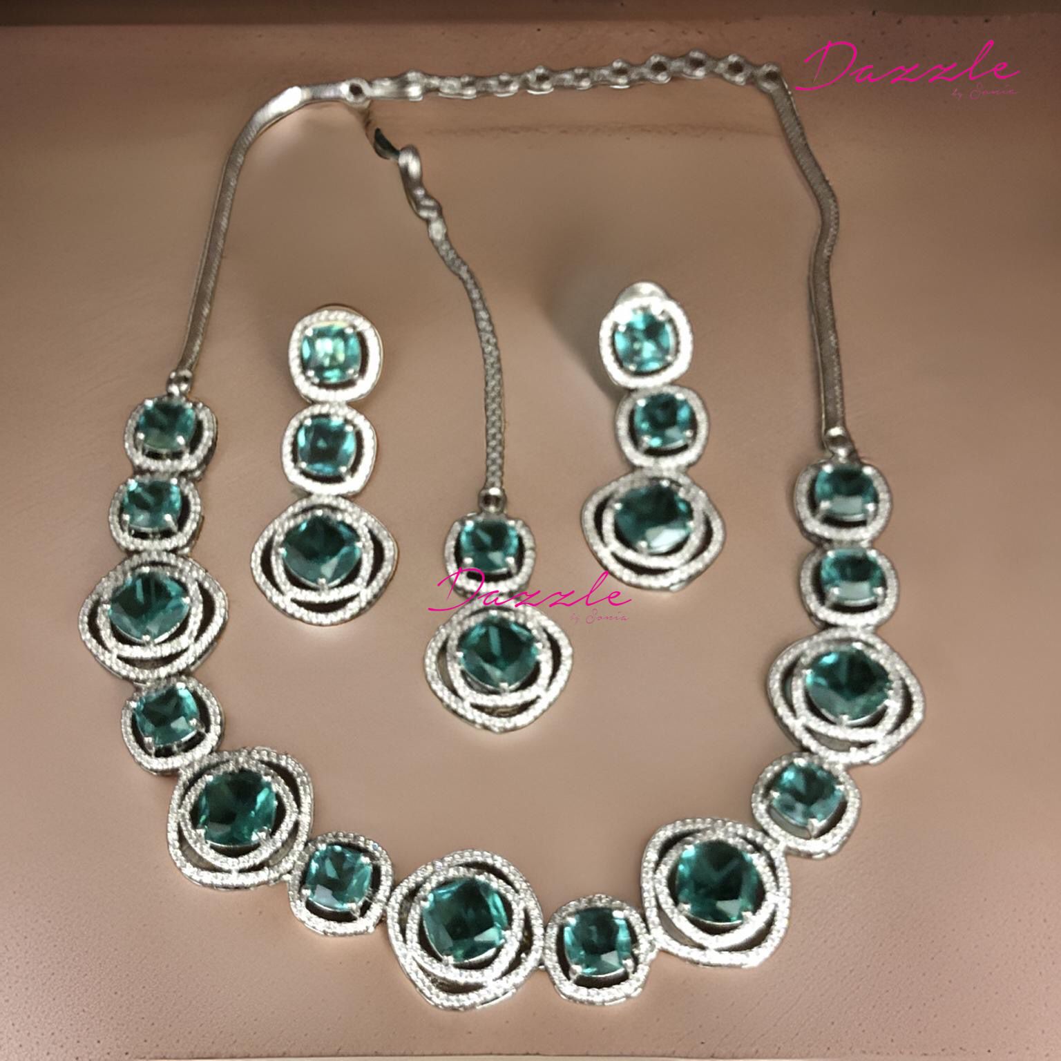 AD Light Green Necklace Set with Earrings and Mang Tikka in Brass