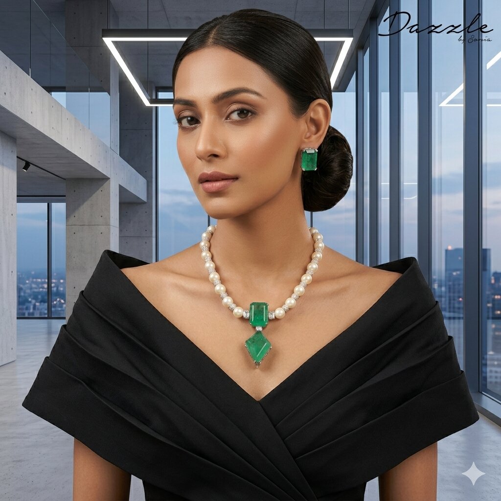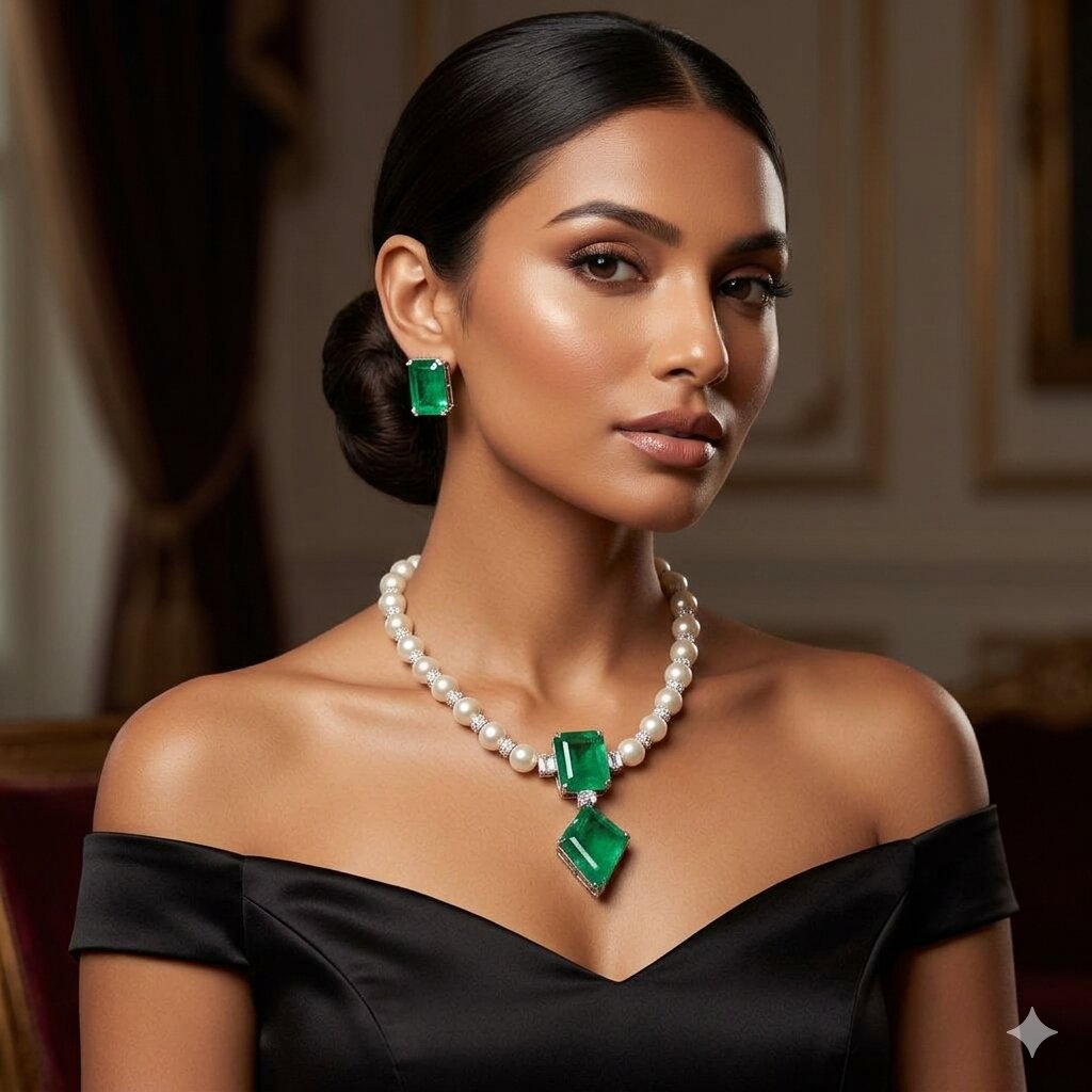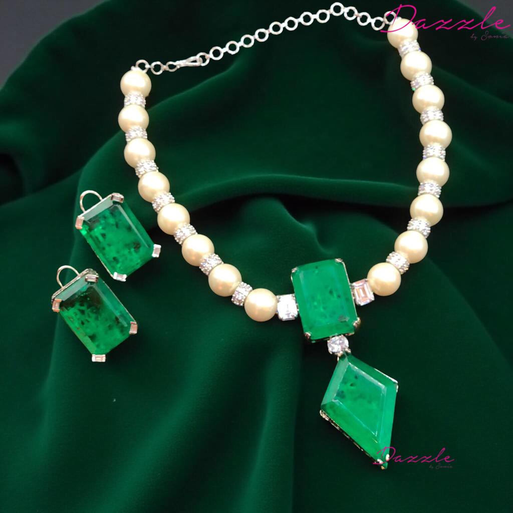 This green emerald necklace features high-quality AAA zirconia stones set on a premium brass base with a luxurious finish. Designed for weddings, parties, and festive occasions, it offers a perfect combination of durability, elegance, and sparkle.