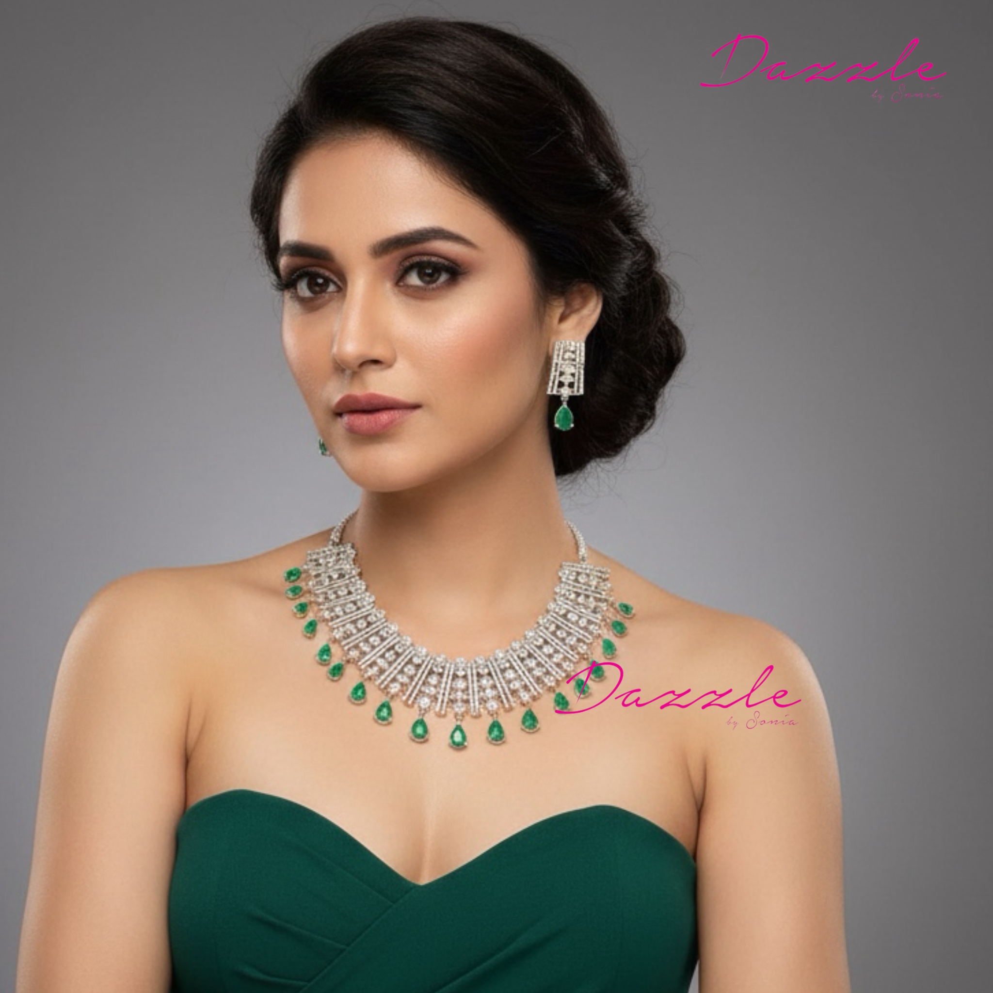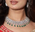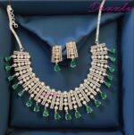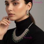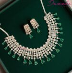 A celebration of color and brilliance, this Green AAA Zirconia Necklace is where artistry meets sophistication. The luminous zirconia stones are expertly arranged to create a seamless flow of sparkle, while the deep green hues bring an opulent, regal touch. Inspired by timeless royal jewellery, this piece is designed for the modern woman who loves to make a statement. Whether styled with a saree, lehenga, or evening gown, it transforms your entire look into one of effortless glamour and grace.