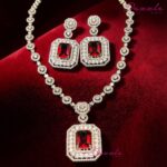 The Modern Classic: Pair it with a plunging V-neck or an off-shoulder black cocktail dress to let the crimson stones pop against your skin.