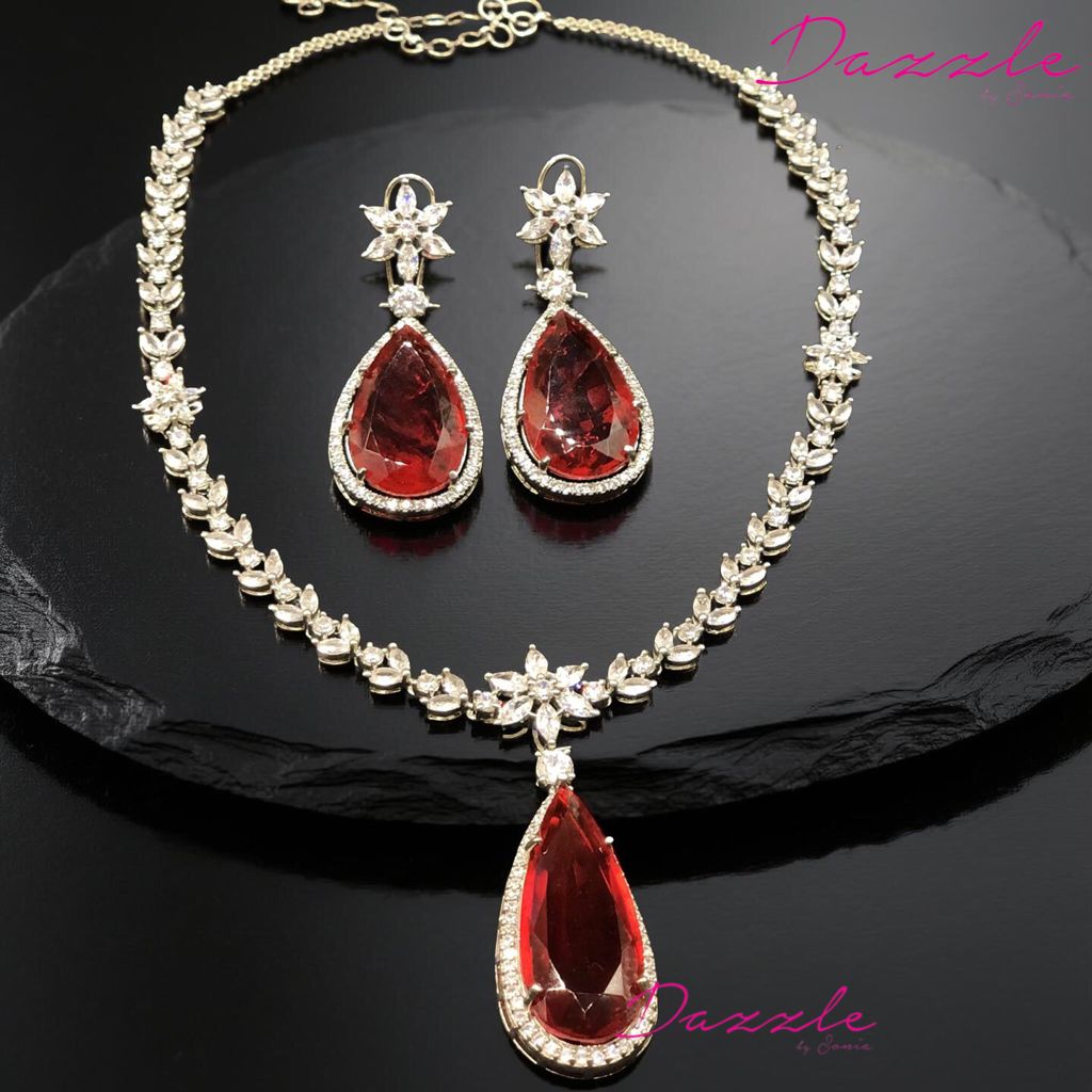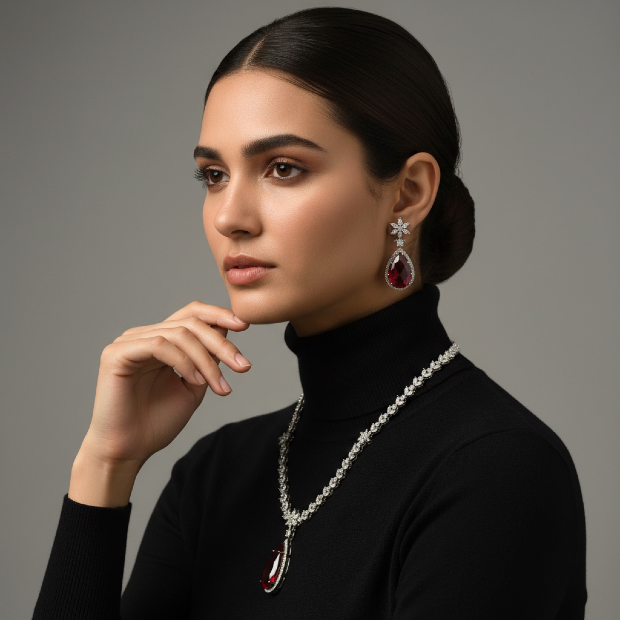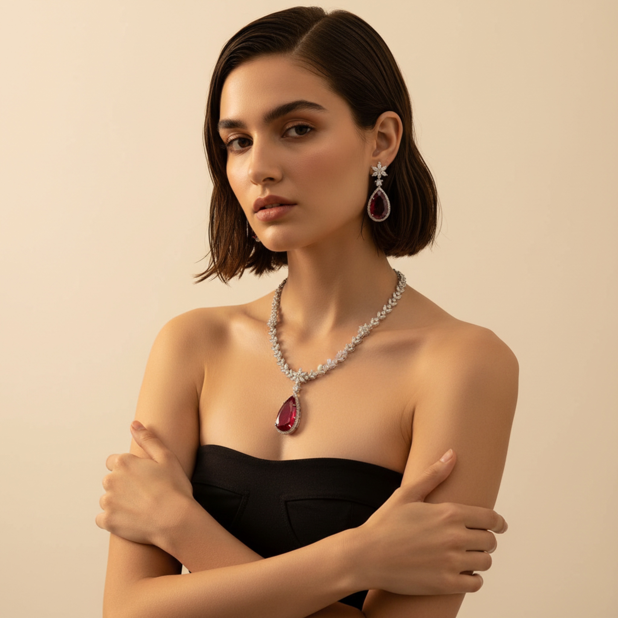 Ignite your evening look with the breathtaking brilliance of our Red Zirconia Necklace Set. Designed for the woman who commands attention, this set features high-grade AAA Cubic Zirconia stones that mimic the depth and fire of genuine rubies. Each stone is precision-cut and hand-set to ensure maximum light refraction, creating a “dazzle” that lasts from the first toast to the final dance.