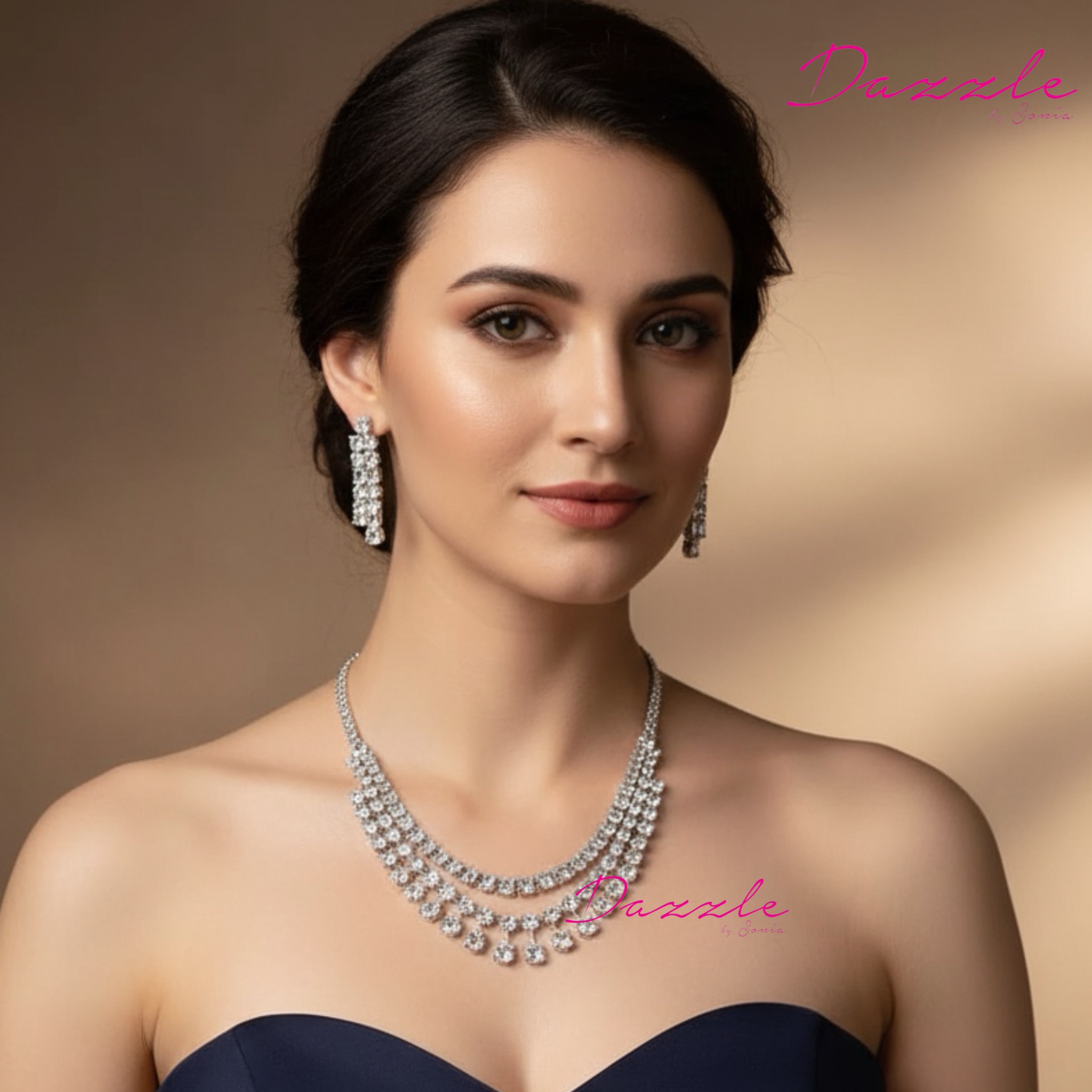 A perfect blend of luxury and versatility, this Silver AD Necklace features finely cut American Diamonds that reflect light beautifully. Set on durable, high-quality metal with a premium silver polish, it ensures long-lasting shine and elegance. Lightweight and comfortable, it’s ideal for weddings, parties, or elevating your daily style.