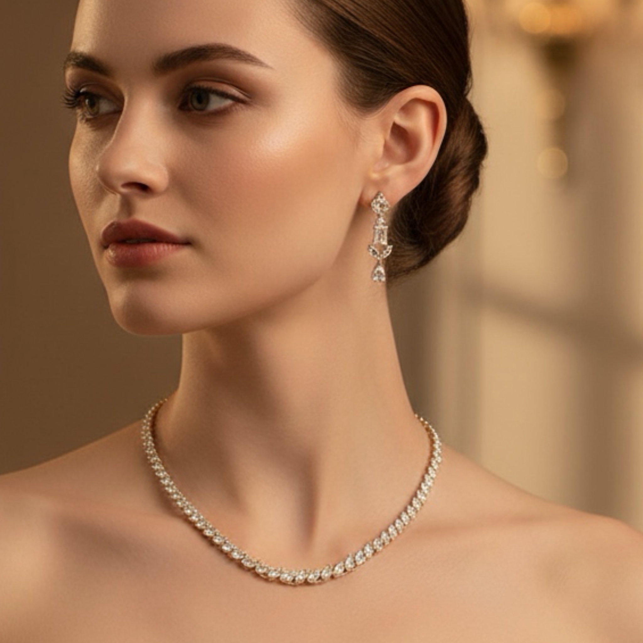 Elevate your elegance with our stunning Silver AD Necklace, crafted with precision and brilliance. Designed with high-quality American Diamonds set on a sleek silver finish, this piece radiates sophistication and charm. Perfect for both everyday glam and special occasions, it adds a refined sparkle to every look.