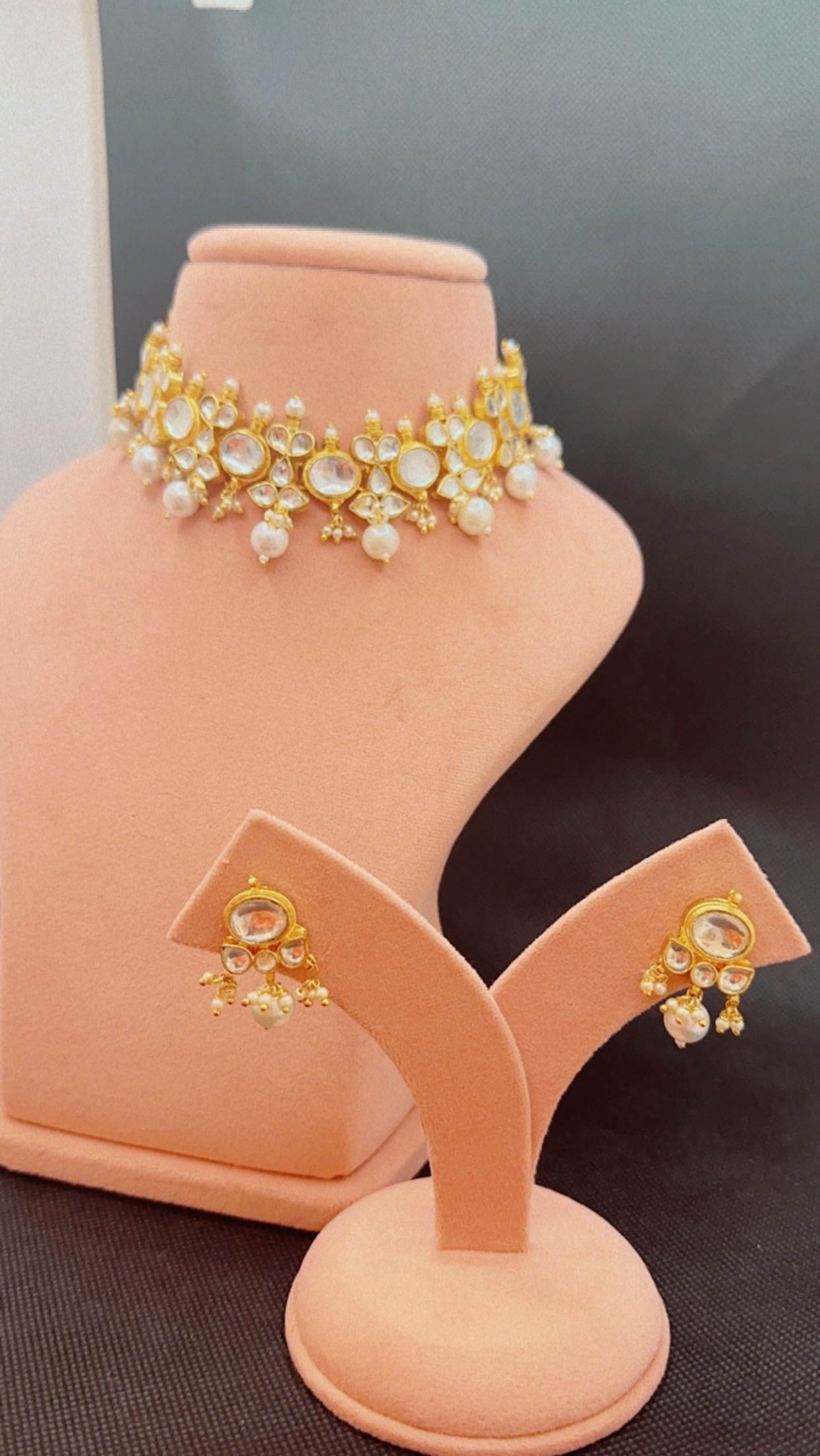 Traditional ahedabadi Kundan & Pearl Gold Plated Choker Necklace Set for Women will complement any Indian attire. Women Love Jewelry as it not only enhances their beauty, but also gives them the social confidence. Make your moment memorable with this range. This jewel set features a unique one of a kind traditional embellish with antic finish. Earrings are very easy to use being lightweight and has a design which makes it very comfortable.