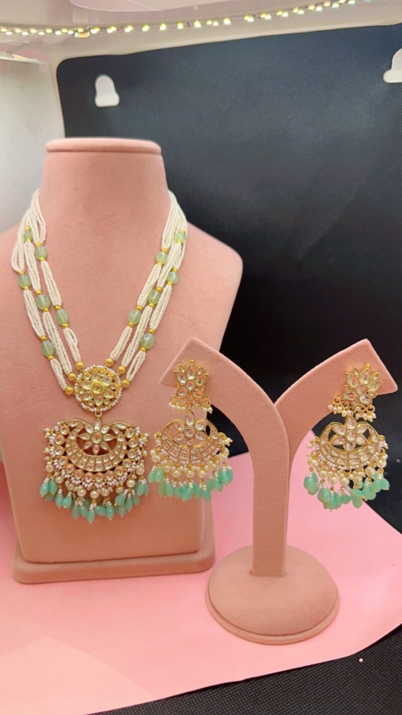 Mint green traditional Ahmedabad  Kundan necklace with gold polish earrings.