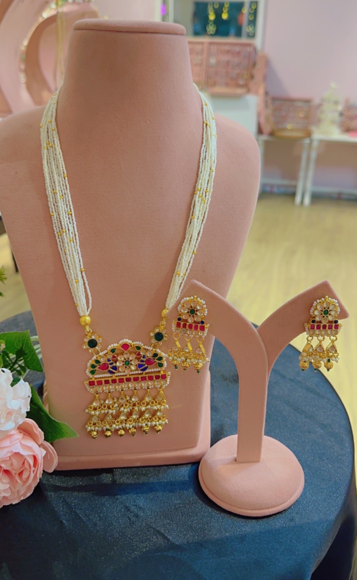 Red and Green with mini pearls multi-chains with beautiful matching earrings sets which will look perfectly on devotional and all festive occasion.