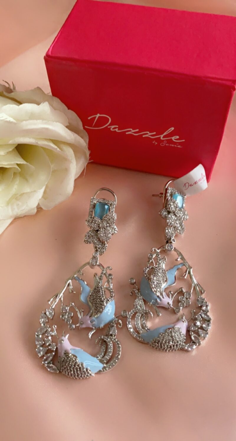An Aqua long earrings having two birds structure shows the love which is very perfect gift for valentine.