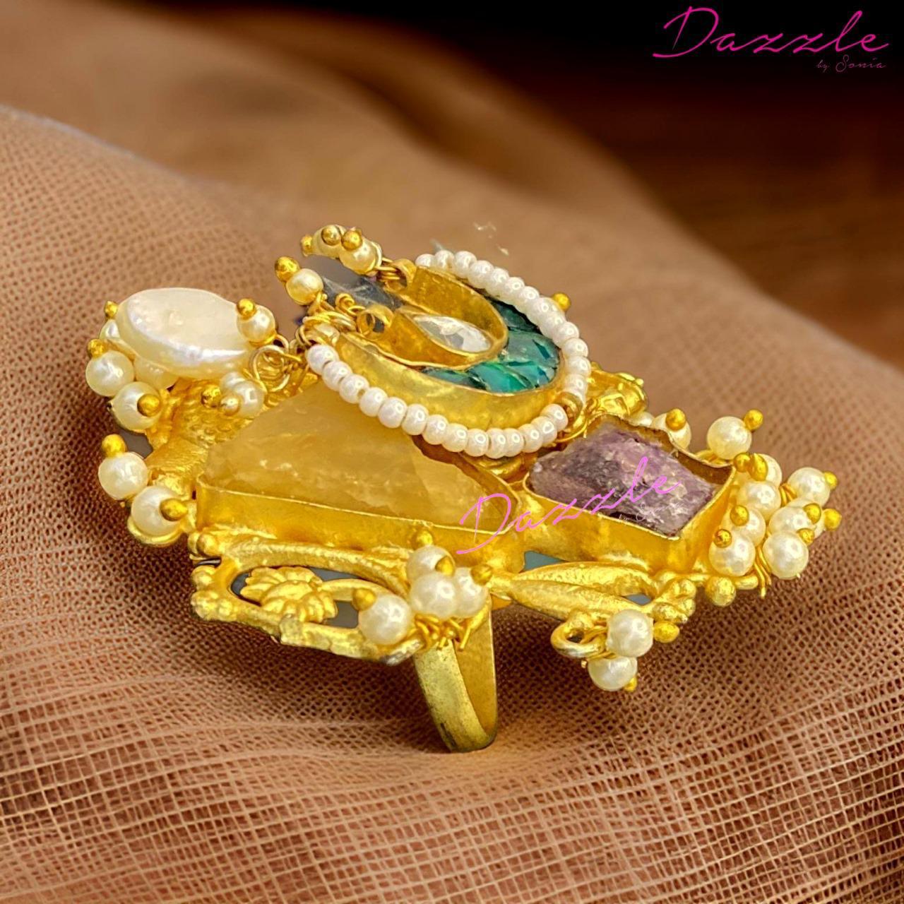 Elevate your elegance with this timeless adjustable Kundan ring from Dazzlebysonia. Handcrafted with traditional Kundan artistry, it features radiant stones set in a luxe finish that adds royal charm to every look. The adjustable design ensures a perfect fit, making it ideal for festive occasions, weddings, and statement everyday wear.