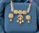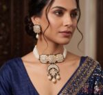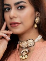 Blending traditional artistry with a modern silhouette, this Kundan necklace is perfect for today’s style-conscious woman. The refined arrangement of stones on a durable brass base offers both elegance and versatility, making it suitable for festive wear as well as statement styling.