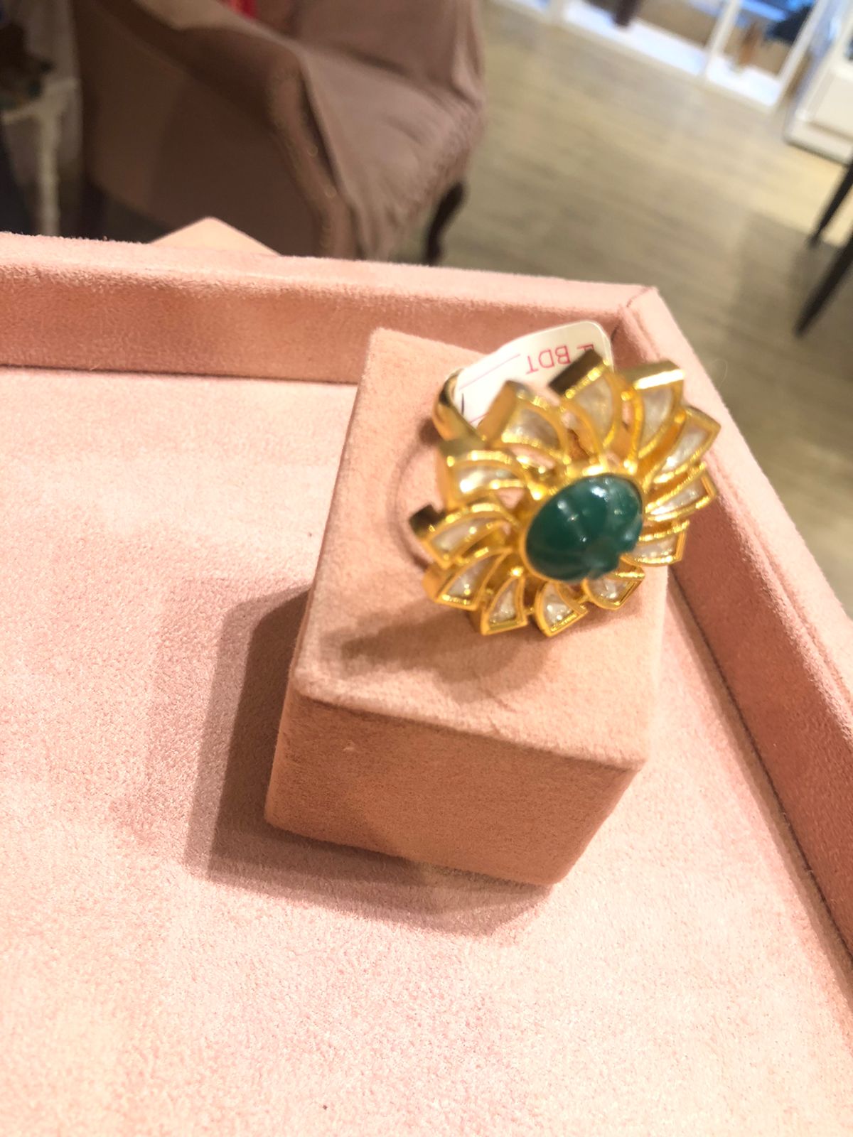 FLORAL SHAPE KUNDAN GREEN STONES AND MADE WITH GOLD-PLATED RING
