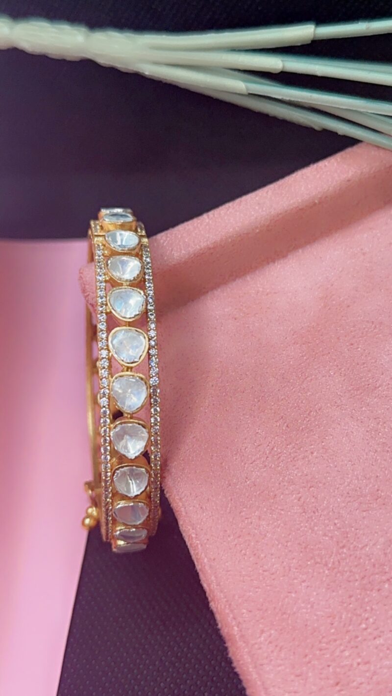 Kundan is a traditional form of Indian gemstone jewelry using gems set with a gold between the stones and its mount. This method of jewelry making is believed to have originated in the royal courts of Rajasthan and Gujarat. It is one of the older forms of Indian gold jewelry making used to adorned gold bangles that are made and worn in India and by Indian people throughout the world.