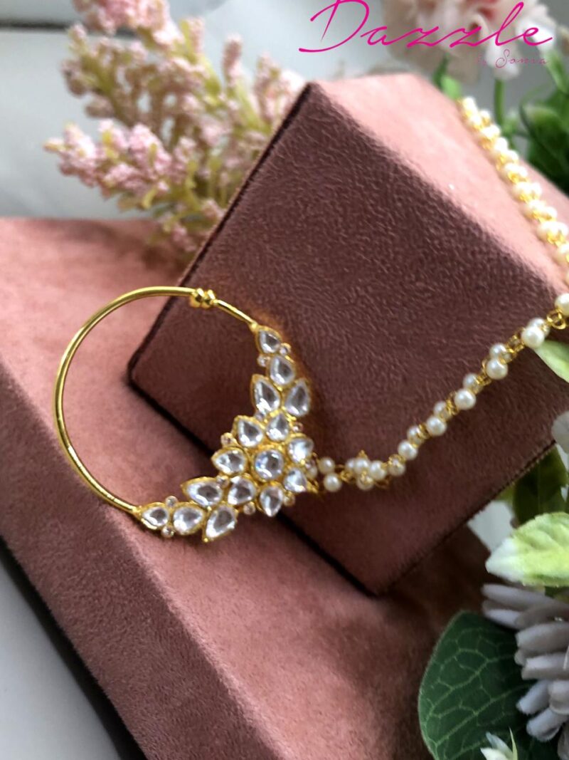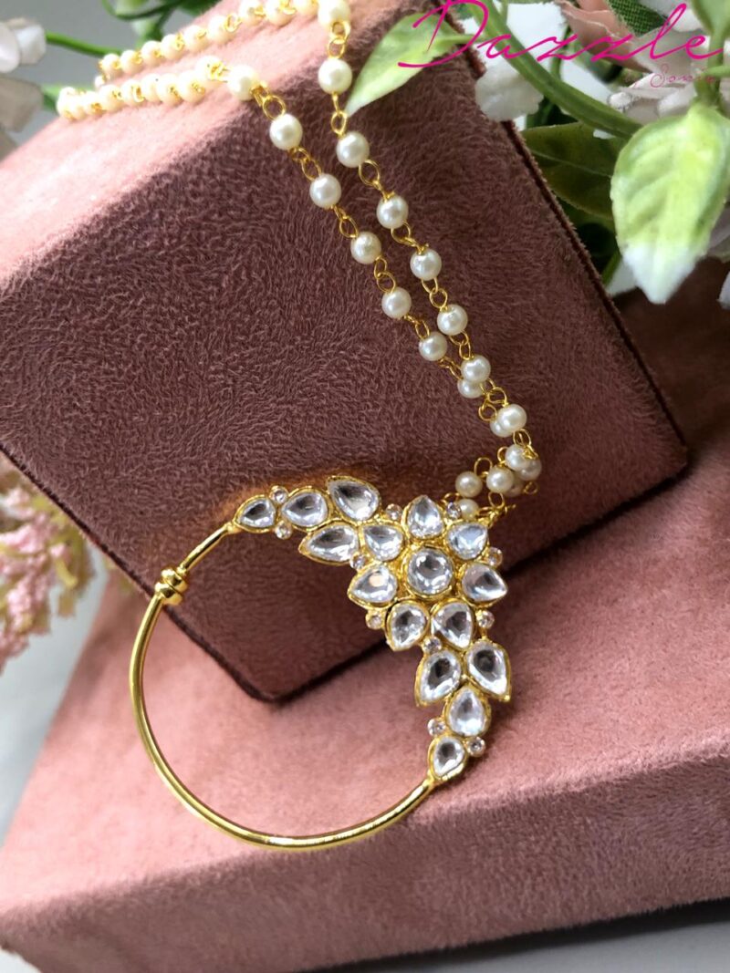 This traditional nose pin is crafted in gold-plating and features Pearl beaded clip-on nose ring with chain, connecting to a hook closure. Style this nose pin with your ethnic attires for festive ready look. No piercing required. Perfect Accessory for every jewelry box! This nose ring/nath is made with high-quality materials, including a durable gold plating and sophisticated pearl stone encasement, to provide both luxurious elegance and longevity