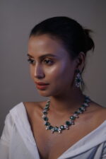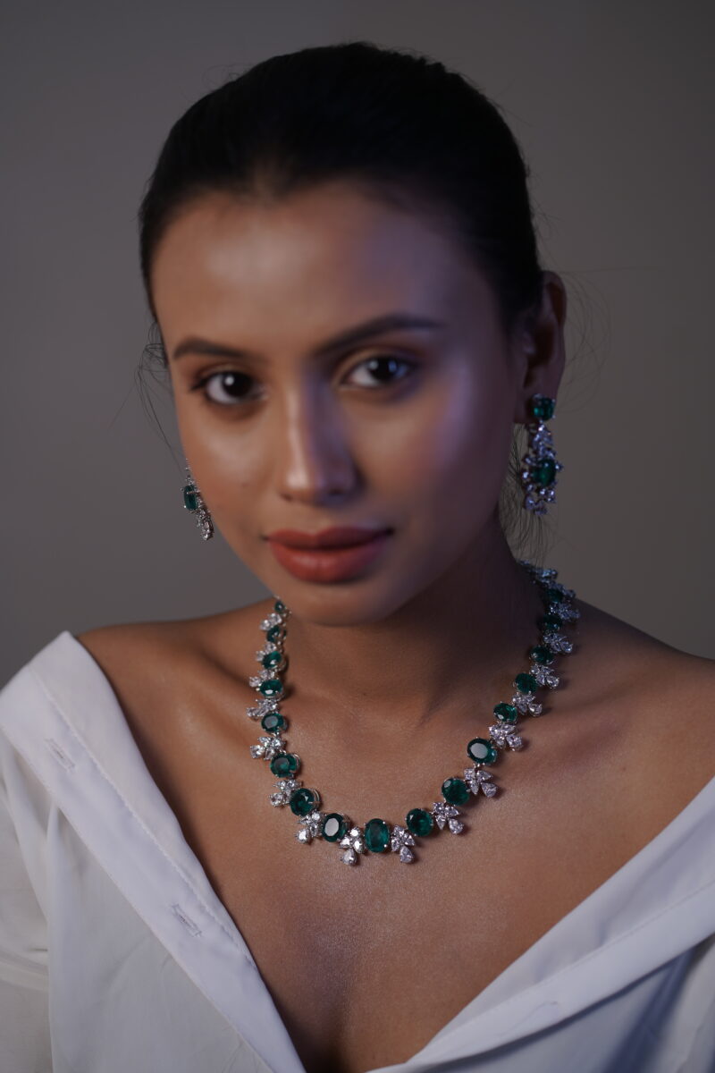 2. “Add a touch of glamour to your wardrobe with this exquisite green emerald stone necklace set. The intricate design and matching earrings are perfectly complemented by the green emerald stones, creating a truly eye-catching piece. Whether you’re dressing up for a special occasion or just want to add some extra style to your daily look, this necklace set is sure to impress.”