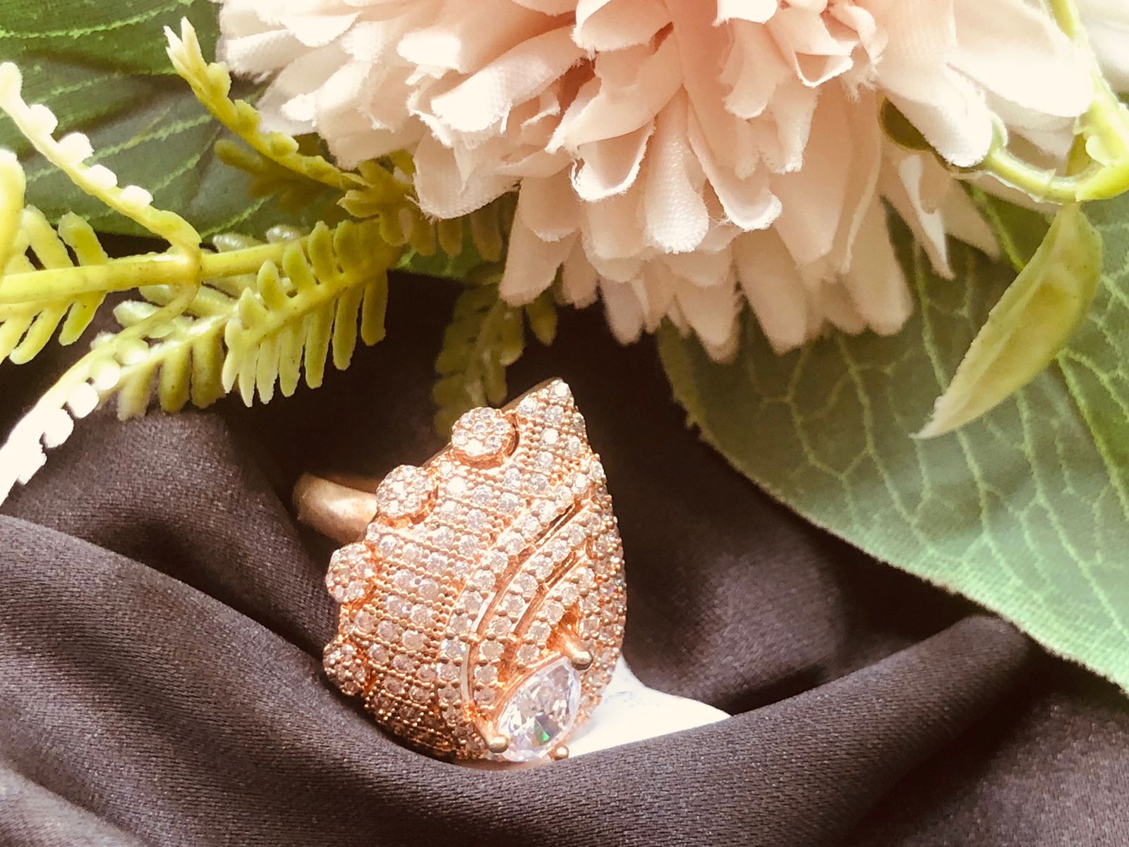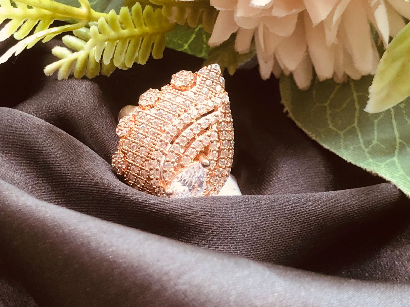 The rose gold-plated ring features high-quality American diamond stones that are designed to look like original diamonds. The American diamond ring is typically made with a rose gold-plated material, which adds to the ring’s durability and longevity.