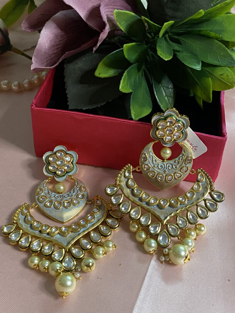 Kundan earrings are a timeless piece of jewelry that add a touch of traditional elegance to any outfit. These earrings are handcrafted using the ancient technique of kundan setting, where precious and semi-precious stones are carefully set into gold or brass using melted wax. The result is a stunning work of art that shines and sparkles with every movement. Kundan earrings come in a variety of designs, from simple and minimalist to grand and elaborate. They are perfect for special occasions such as weddings or festivals, and also make for a beautiful addition to any jewelry collection. Discover the beauty and craftsmanship of kundan earrings on our website today!