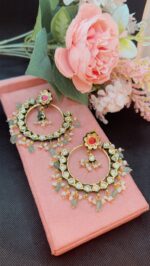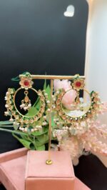 Gold plated on Brass meta arrange the polki stone circular Multi color of Red, White and green, The Polki and Pearl drop down alternate to each other and its perfectly for Indian Traditional attire.