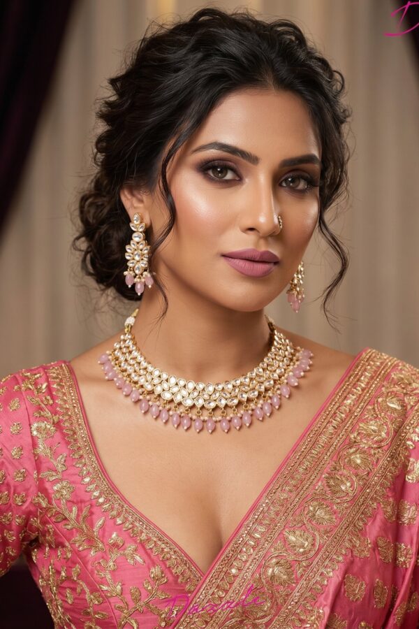 Inspired by royal heritage, this Polki-style Kundan necklace showcases uncut-style stones set beautifully on a brass base. The design exudes old-world charm while maintaining a luxurious finish, making it an ideal choice for weddings and traditional occasions.