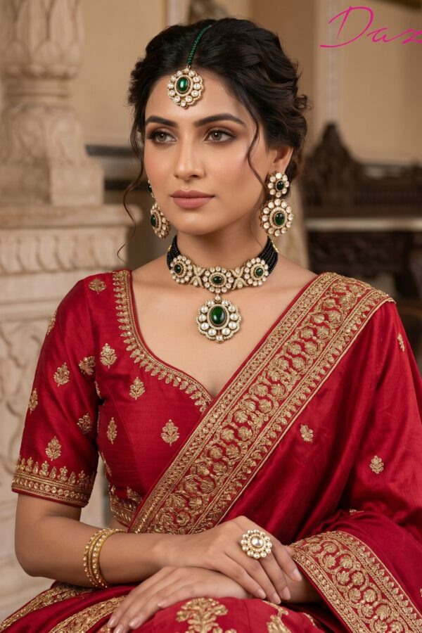 Inspired by royal heritage, this Polki-style Kundan necklace showcases uncut-style stones set beautifully on a brass base. The design exudes old-world charm while maintaining a luxurious finish, making it an ideal choice for weddings and traditional occasions.