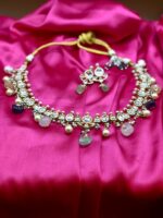 2. “Add a touch of sophistication to your wardrobe with this stunning Kundan Kalli multi-coloured stone necklace set. Featuring delicate kundan stones and intricate kalli design, this set is perfect for women seeking a stylish and elegant accessory.”