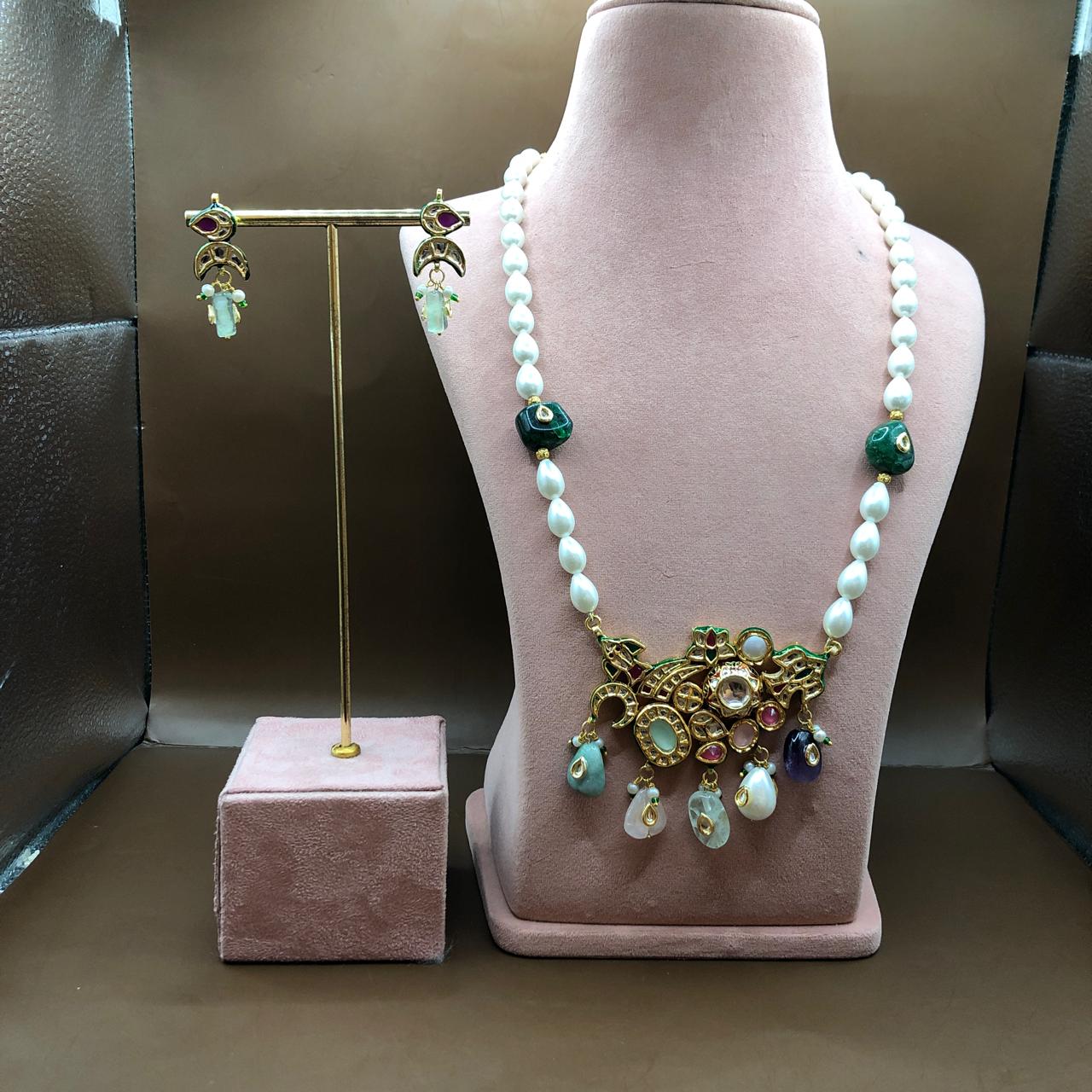 1. “This exquisite Kundan Kalli necklace set is a masterpiece of craftsmanship, featuring a vibrant mix of multi-coloured stones, including emerald green, sapphire blue, ruby red, and more. The intricate kalli design adds a touch of traditional elegance, while the colourful stones give the set a modern twist.”