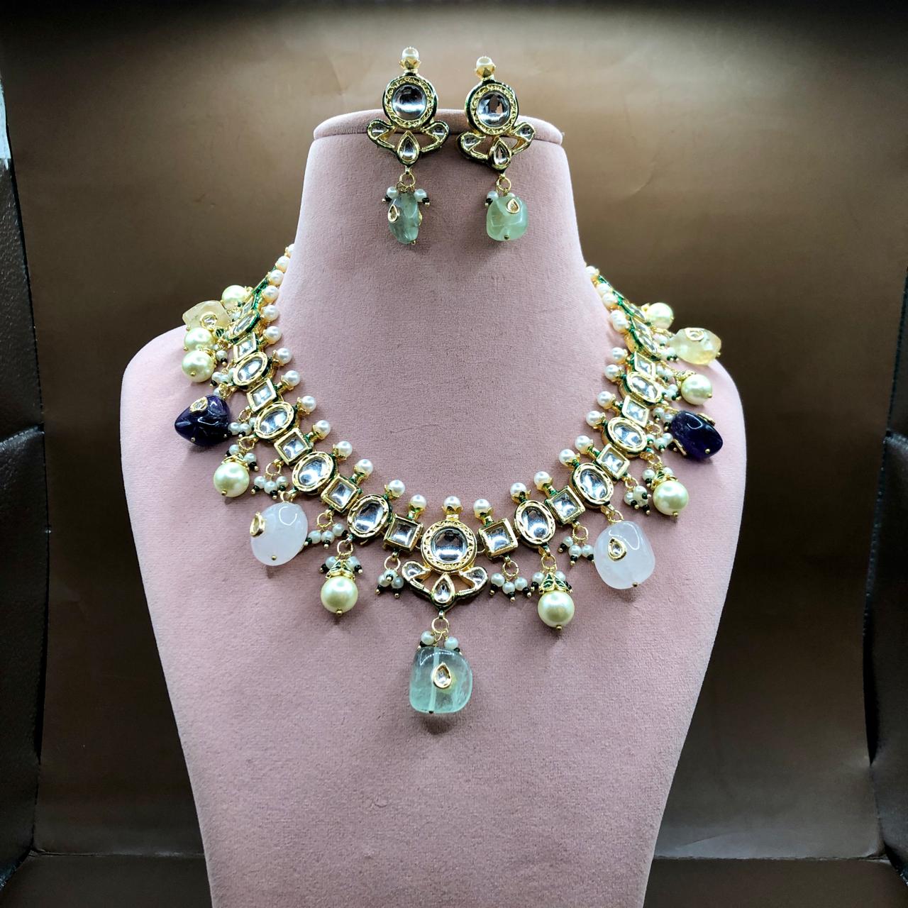 2. “Add a touch of sophistication to your wardrobe with this stunning Kundan Kalli multi-coloured stone necklace set. Featuring delicate kundan stones and intricate kalli design, this set is perfect for women seeking a stylish and elegant accessory.
