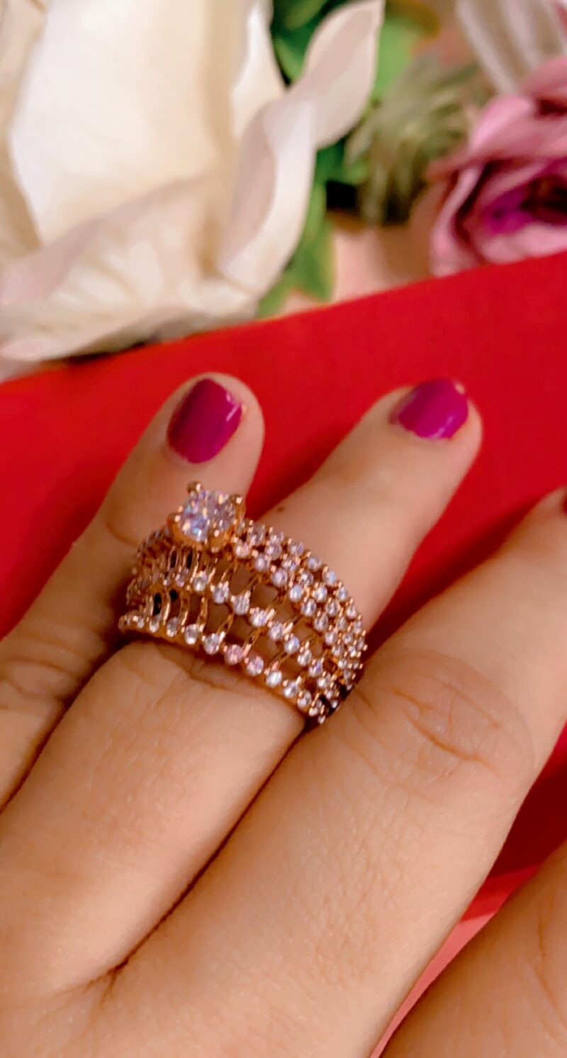 The Rose Gold-Plated Ring for girls and women, crafted from durable brass, is adorned with sparkling American diamonds for a touch of timeless elegance. The adjustable feature ensures a comfortable fit, catering to various finger sizes. Additionally, the rose gold rings embellished with AD stones, add a warm and luxurious accent to this versatile accessory. This ring becomes a charming and adaptable piece suitable for both casual and formal wear.