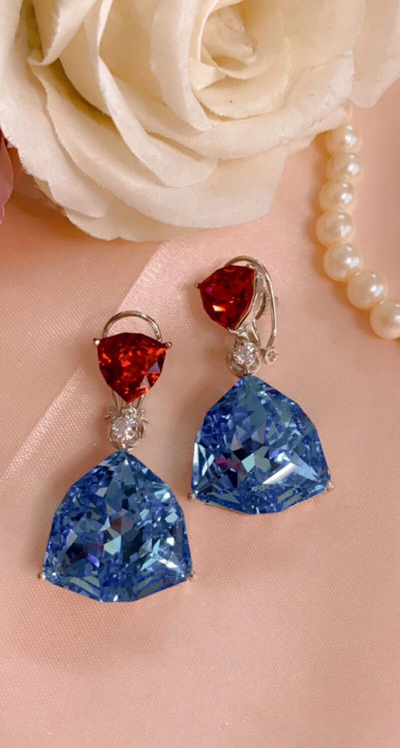 Triplet Color of Ruby Red, Aqua and Silver Swarovski long earring.
