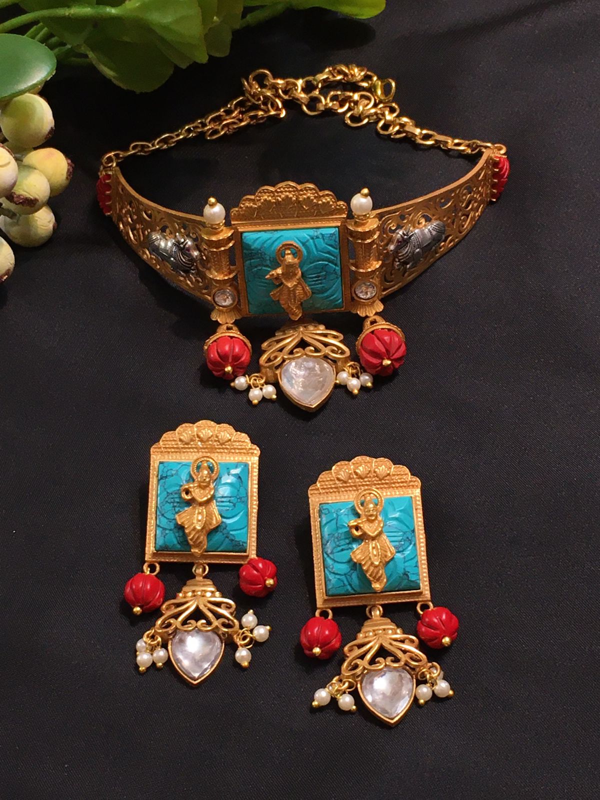 Temple gold Choker temple Design Gold plated south Indian Wedding Traditional temple jewelry set. Latest fashion full Combo for Girls & Women.