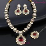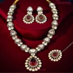 Make a bold statement with this luxurious Polki necklace crafted for modern queens. The intricate design, paired with uncut Polki stones, gives it a majestic and opulent look. Perfect for festive wear or grand occasions, this necklace instantly elevates any outfit.
